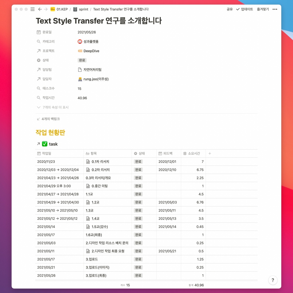 1.Text Style Transfer 관련 회사 논문을 처음 접한 날로부터 무려 7개월 만에 최종 콘텐츠를 출고했다. 감개가 무량할 따름이다. 사전 리서치 6시간을 포함하면, 글 하나를 쓰는 데 투입한 내 시간 리소스는 대략 41시간에 불과(?)하다.