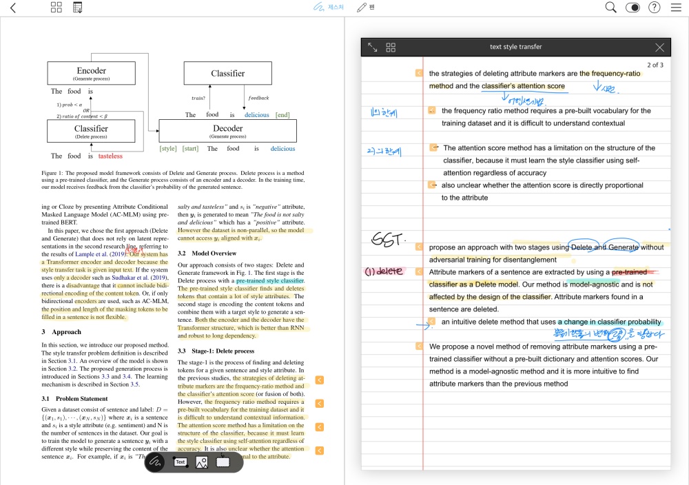 4.복습이란 내가 아는 내용을 잘 정리하는 일과도 같다고 볼 수 있을 거다. 그래서 논문에서 밑줄 친 부분을 (노트 패널에) 공통의 토픽으로 그룹화하는 작업을 진행했다. 여기에는 평소에 (영어) 논문을 볼 때 쓰는 플렉슬(flexcil)을 이용했다. 일단 이렇게 해놓고 보니 “어디에 어떤 내용이 있더라?”는 질문에 대한 답을 찾기 위해 논문을 뒤적거릴 필요가 없게 됐다.